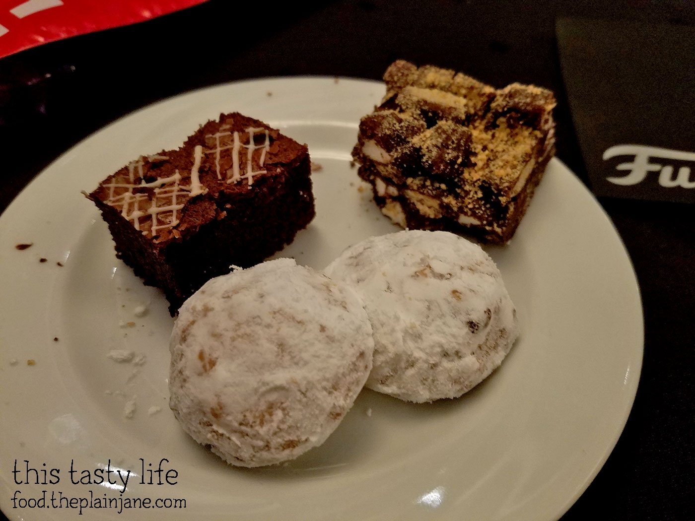 I managed to get a piece of S’mores bark that hardly had an marshmallows in it so I liked it well enough – it was chocolatey and crunchy. The cookies were crunchy and tasty and I managed to get powdered sugar all over myself. The brownies were okay.