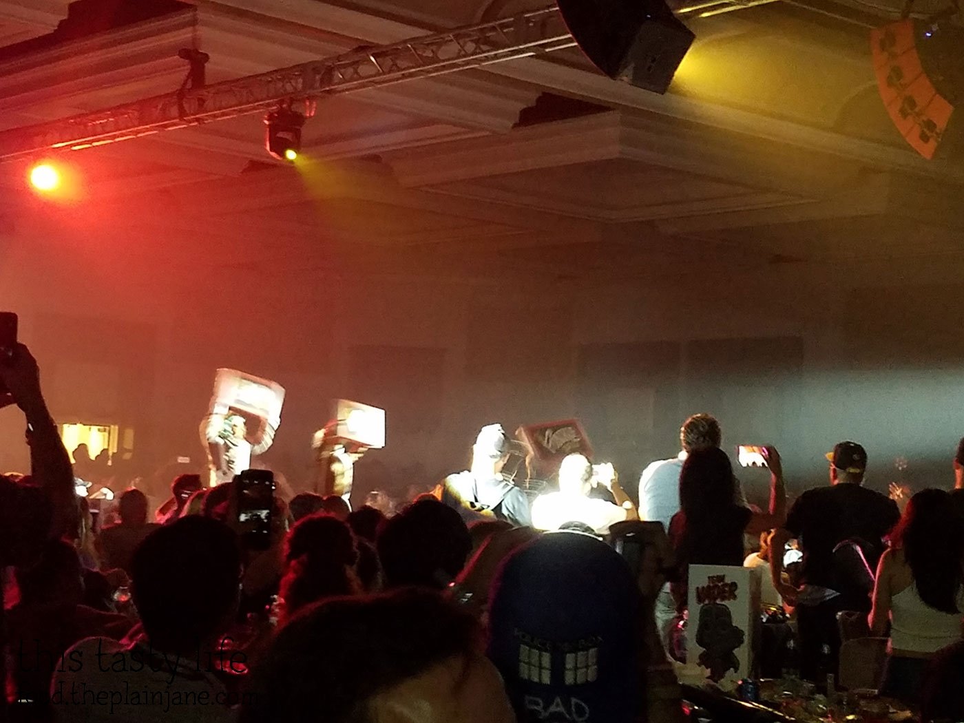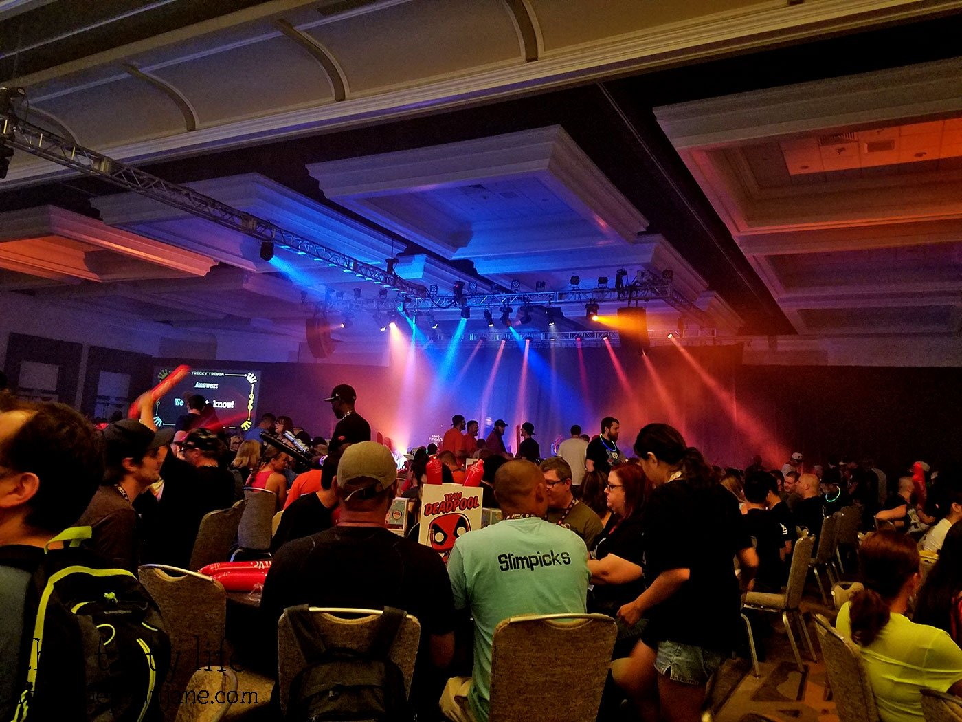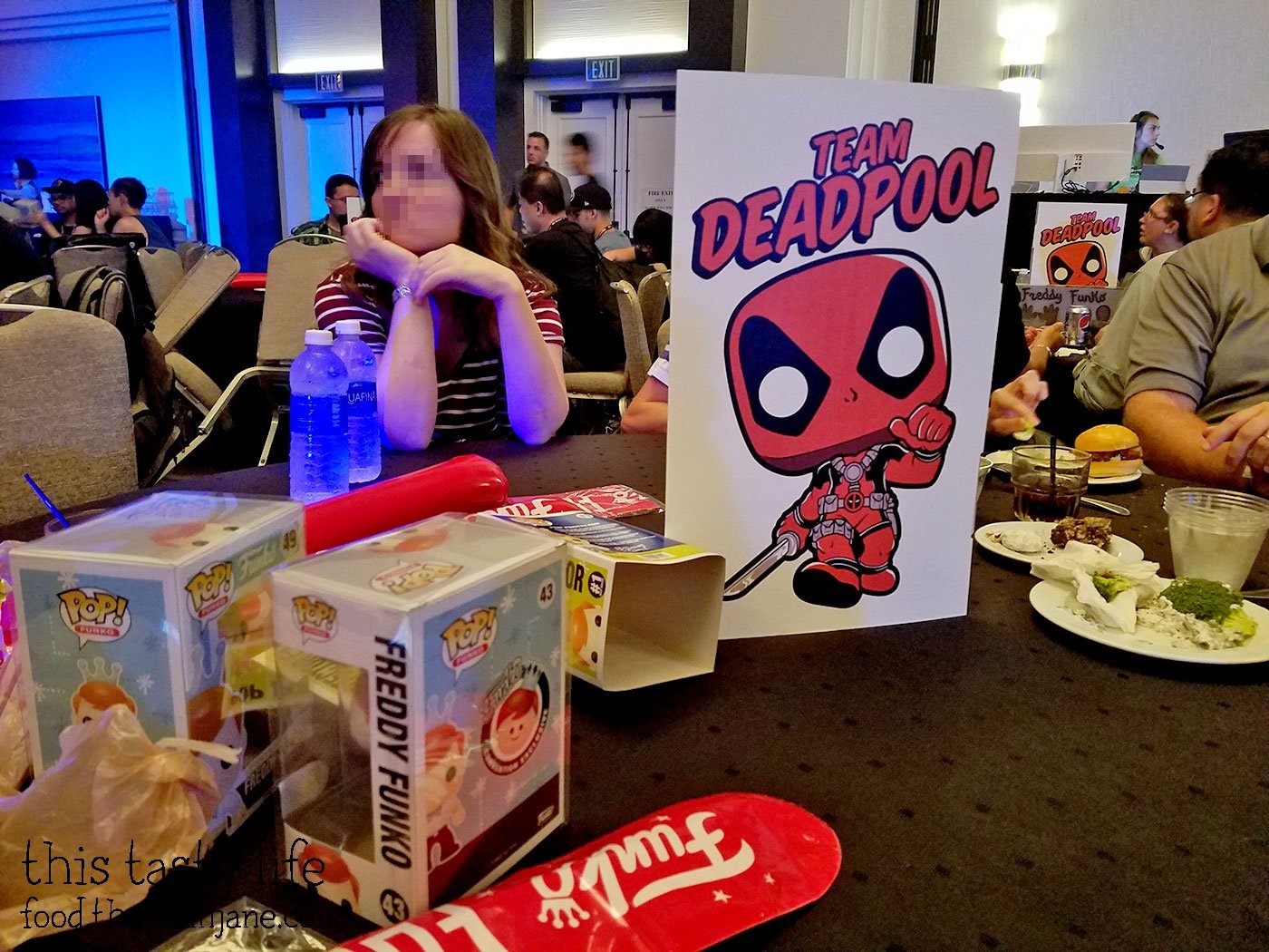In the hall, there was a huge long stage running through the middle of the hall and it was divided into four sections: Team Batman, Team Stitch, Team Vader and Team Deadpool. One of Jake’s friends scoped out a table for us in the Team Deadpool section.